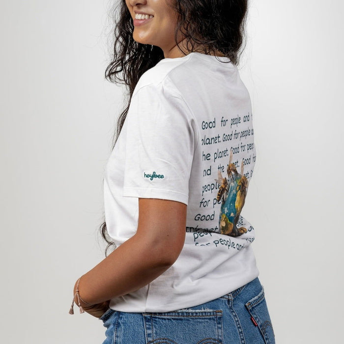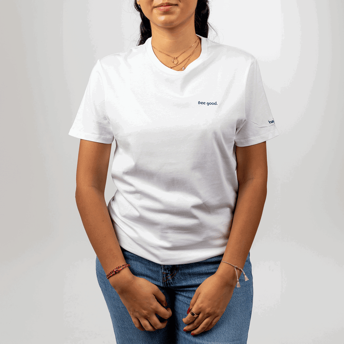 BeeShirt in weiss mit gesticktem "Bee good." auf der Vorderseite und gedrucktem Bild auf der Rückseite.