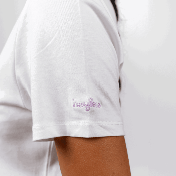 BeeShirt in weiss mit gesticktem "Sweet like honey" und gedruckten Blumen der Vorderseite.