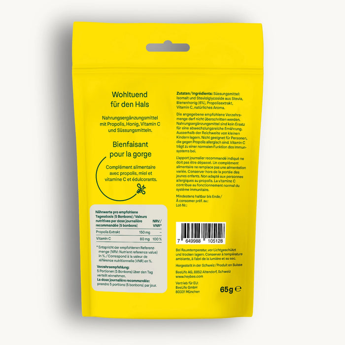 Délicieux bonbons à la propolis, au miel et à la vitamine D. Apaisant pour la gorge et la gorge et renforce le système immunitaire. Aux arômes naturels.