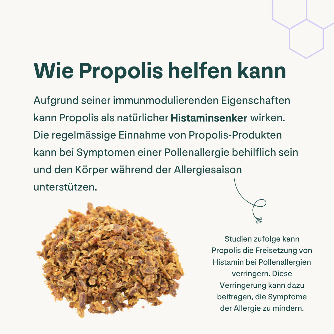Pour un soutien interne, nous recommandons de prendre 2 capsules chaque matin pendant la saison des pollens. Nos capsules de propolis sont riches en antioxydants naturels et aident à renforcer le corps contre les allergènes.
