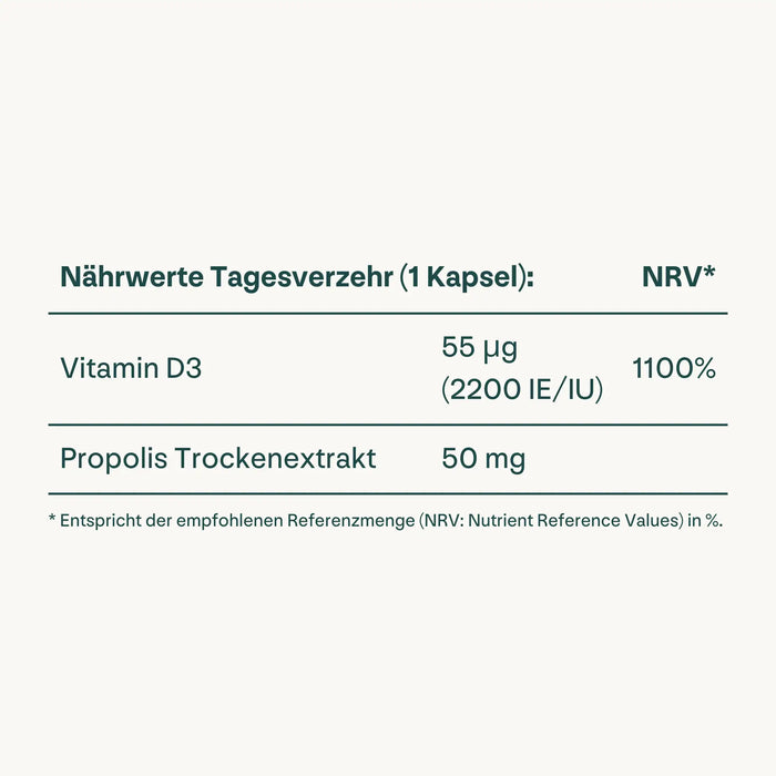 Unser Präparat vereint das Sonnenvitamin D3 (2200 I.E.) mit der natürlichen Kraft von Propolis – für ein starkes Immunsystem, gesunde Knochen und Muskeln sowie zur Unterstützung des Wachstums bei Kindern.